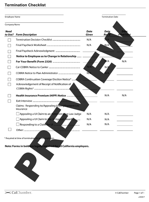 California termination checklist 2020. COVID-19 Workplace Exposure Notification Checklists. Check for proper use and ratings of splices and terminations. Claim until the benefit year of the claim ends.